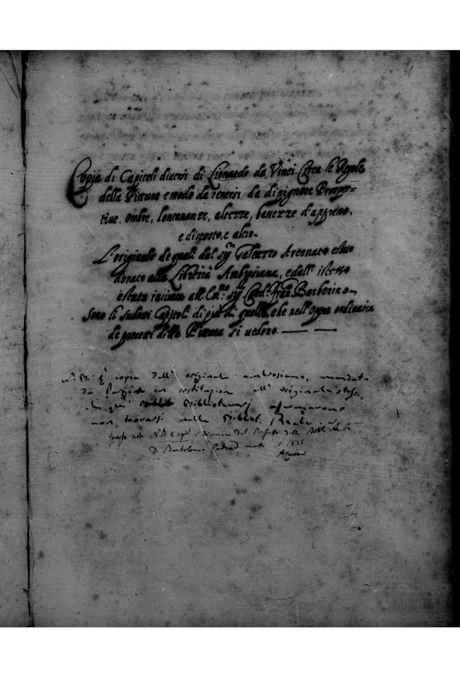 Copia di Capitoli diversi di Leonardo da Vinci circa le regole della pittura e modo da tenersi da dipingere prospettive ombre, lontananze, altezze, bassezze, dapresso e discosto e altro